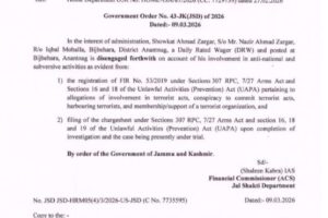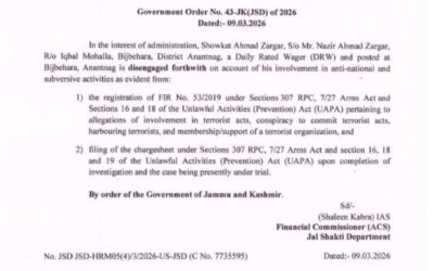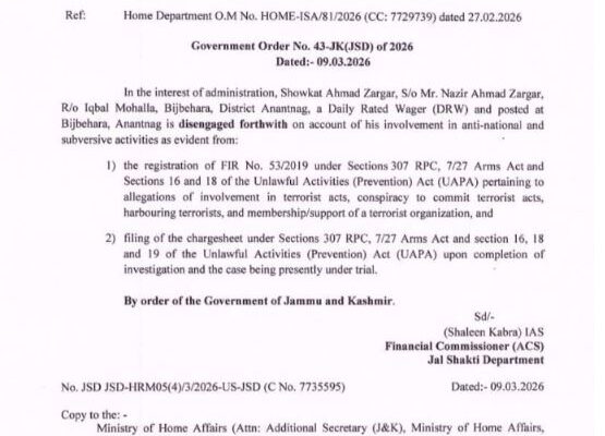 JAMMU, MAR 10: The Jammu and Kashmir Government has terminated three workers of the Jal Shakti Department after their alleged involvement in anti-national and subversive activities came to light. According to an order issued by the Jal Shakti Department, “In the interest of administration, Showkat Ahmad Zargar, son of Nazir Ahmad Zargar of Iqbal Mohalla,…