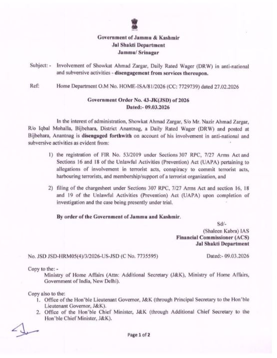 According to an order issued by the Jal Shakti Department, “In the interest of administration, Showkat Ahmad Zargar, son of Nazir Ahmad Zargar of Iqbal Mohalla, Bijbehara, District Anantnag, a Daily Rated Wager (DRW) and posted at Bijbehara, Anantnag is disengaged forthwith on account of his involvement in anti-national and subversive activities”.