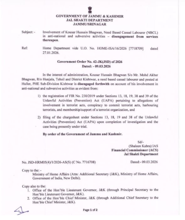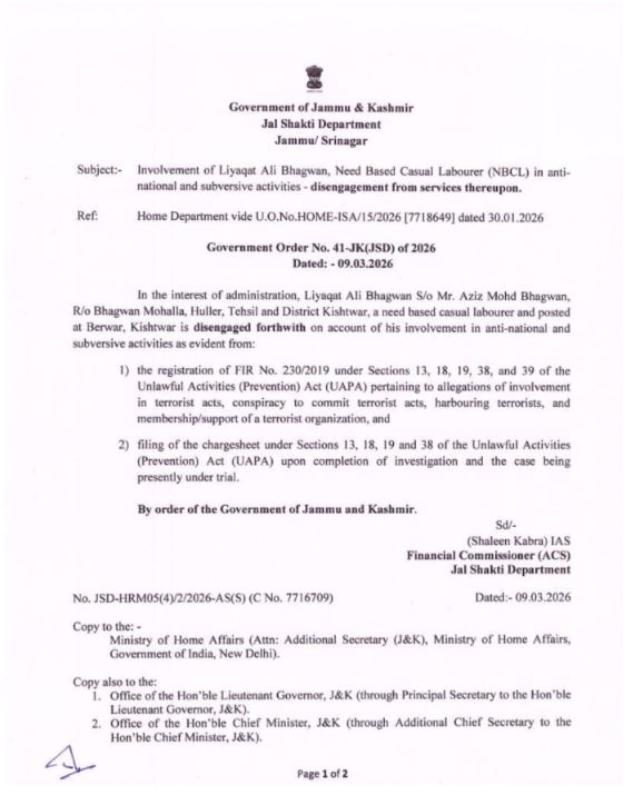 One more order issued by the Jal Shakti Department reads, “In the interest of administration, Kousar Hussain Bhagwan, son of Mohd Akbar Bhagwan of Hunjala, District Kishtwar, a need based casual labourer and posted at Huller, PHE Sub-Division Kishtwar is disengaged forthwith on account of his involvement in anti-national and subversive activities as evident from, the registration of FIR Number 230/2019 under Sections 13, 18, 19, 38 and 39 of the Unlawful Activities (Prevention) Act (UAPA) pertaining to allegations of involvement in terrorist acts, conspiracy to commit terrorist acts, harbouring terrorists, and membership/support of a terrorist organization”.